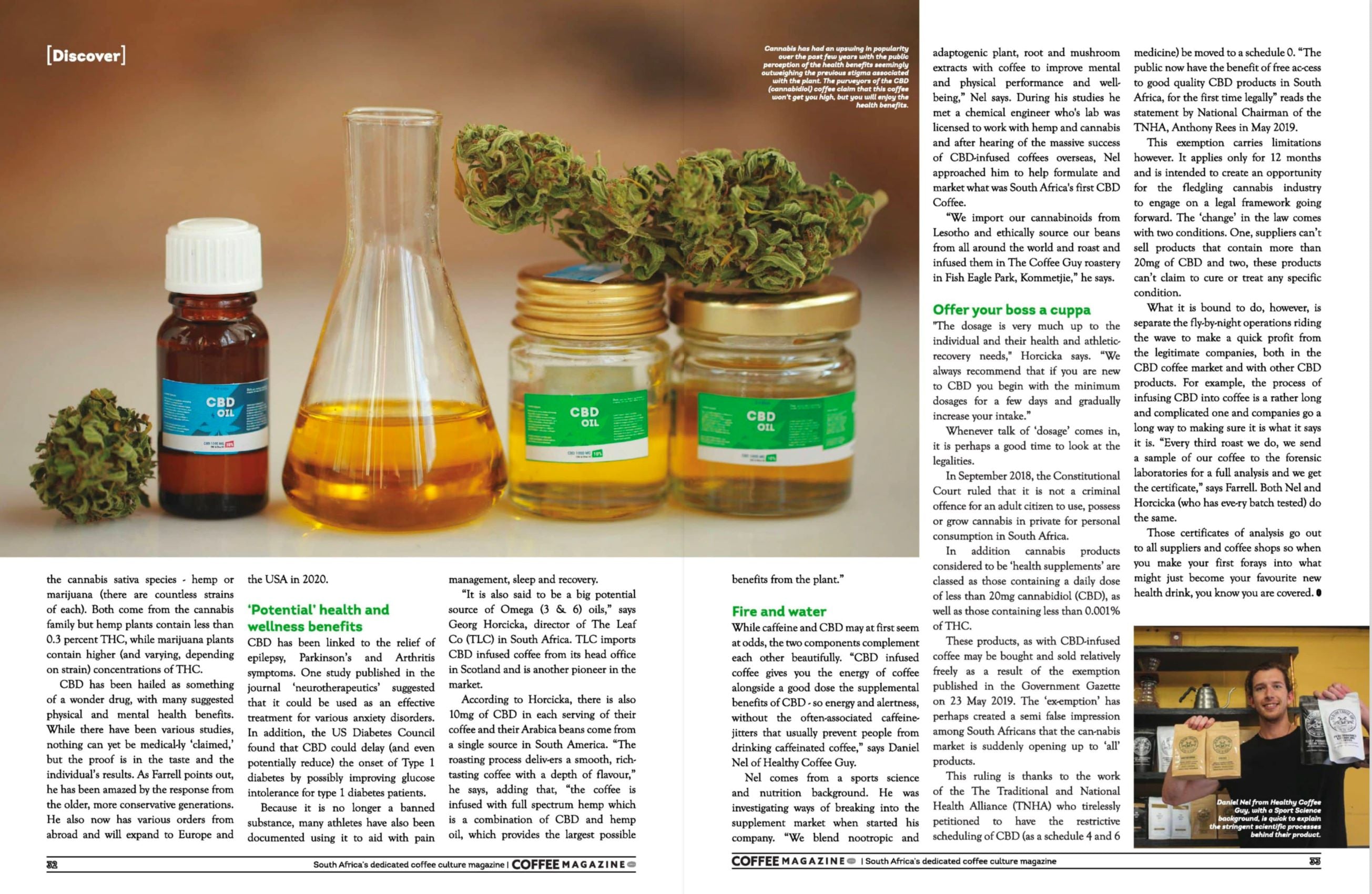 We were also the first in Africa to infuse coffee with Nootropics, Adaptogens, Medicinal Mushrooms and Cannabinoids. As seen in RSA Coffee Magazine 2019.